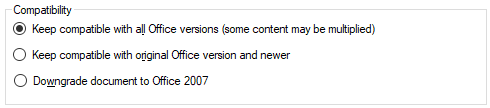 | Einstellung | Importierte Erweiterungen | Exportierte Datei in neuer Office-Version | Exportierte Datei in alter Office-Version |