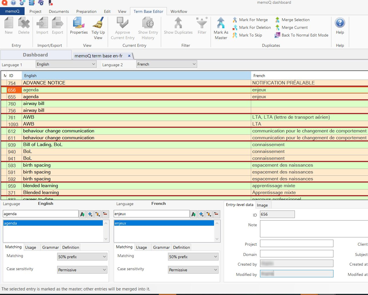 The Term Base Editor allows you to edit a term base directly. You can see the list of entries, filter them, and edit each entry.