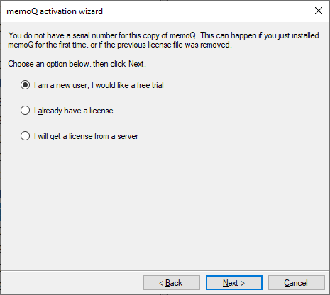 When you start memoQ, and you have no active licenses, the memoQ activation wizard starts automatically.