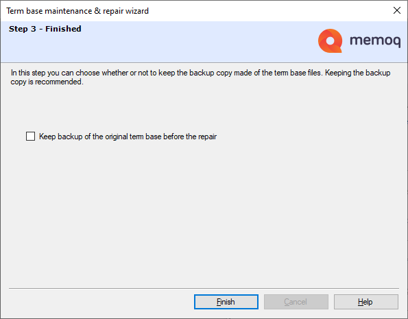 - The repaired term base is ready to use. memoQ can delete the backup copy it made before the repair. To delete the backup copy, clear the Keep backup of the original term base before the repair checkbox.