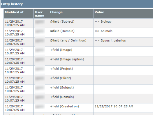 icon. The Entry history section appears, showing what happened to the entry since it was created: