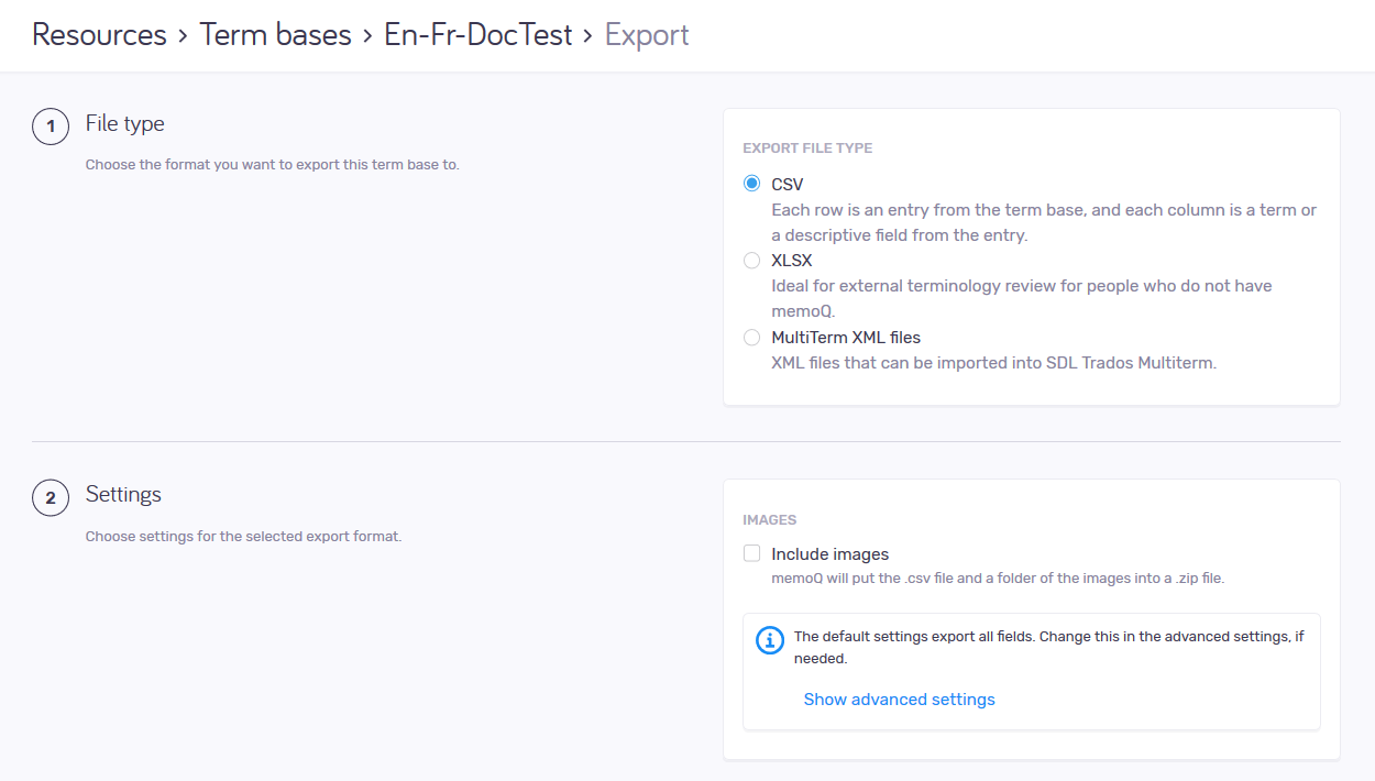 - If you have images in your term base, select the Include images checkbox. memoQweb exports the images and puts them in a ZIP file, together with the CSV file.