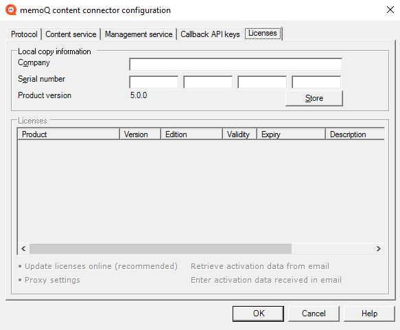 memoQcontent connectorを初めて起動する前に、アクティベーションが必要です。そのためには、シリアル番号とcontent connectorライセンスが必要です。これらを入手するには、memoQ営業に連絡してください。