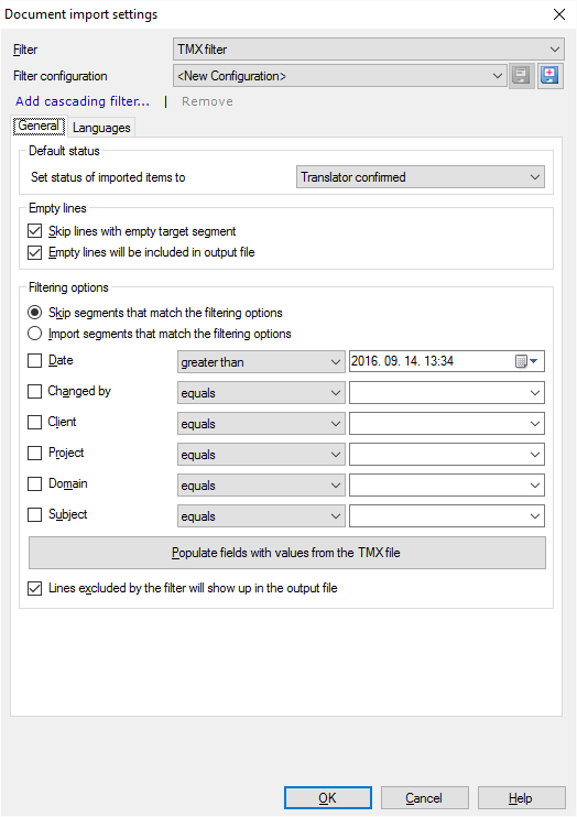 2. 文書のインポートオプションウィンドウでTMXファイルを選択し、フィルタと構成を変更をクリックします。