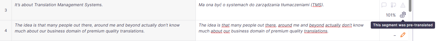 前翻訳が完了すると、memoQ editorはmemoQ editorで以下のアイコンと情報を表示します。