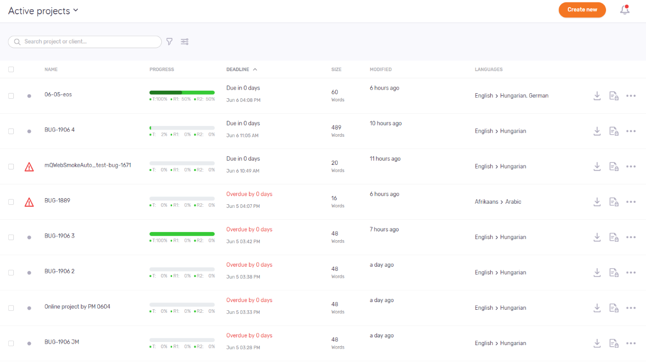 この画面は、管理者またはプロジェクトマネージャがmemoQwebにサインインしたときに開きます。ここでは、オンラインプロジェクトを作成・管理することができます。