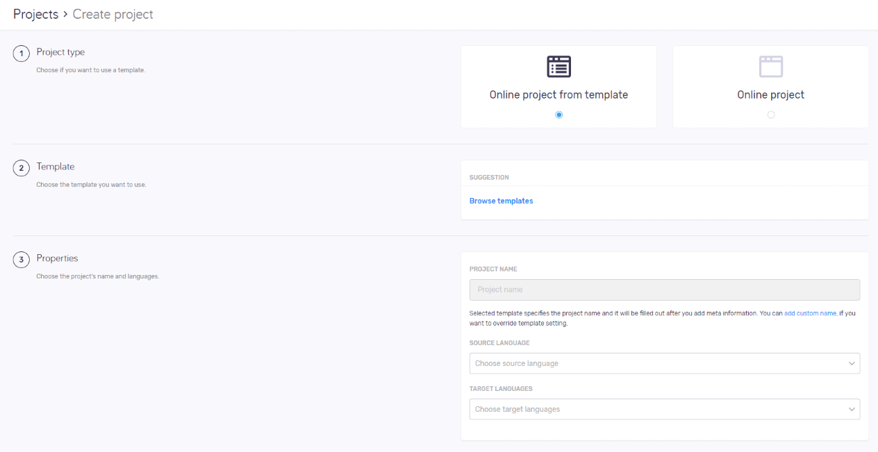 Propertiesセクションで、プロジェクトのName、ソース言語、およびターゲット言語を入力します。テンプレートで定義されている場合は、それを変更することができます。プロジェクト名フィールドの内容を変更するには、テキストボックスの下のカスタム名の追加リンクをクリックします。