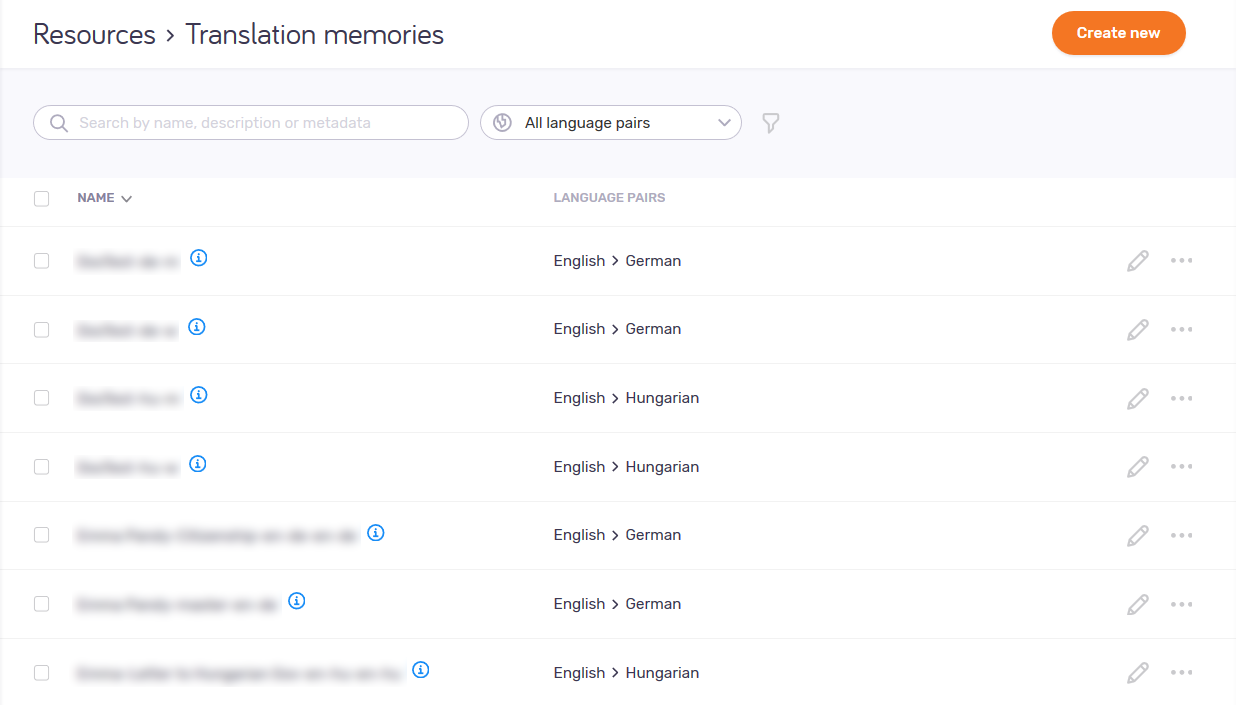 新しい翻訳メモリを作成するには:右上の新規作成ボタンをクリックします。翻訳メモリの作成ページが開きます。